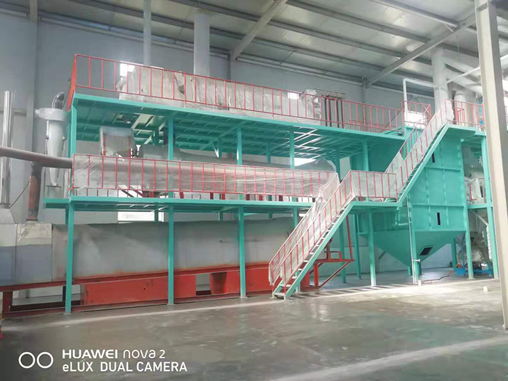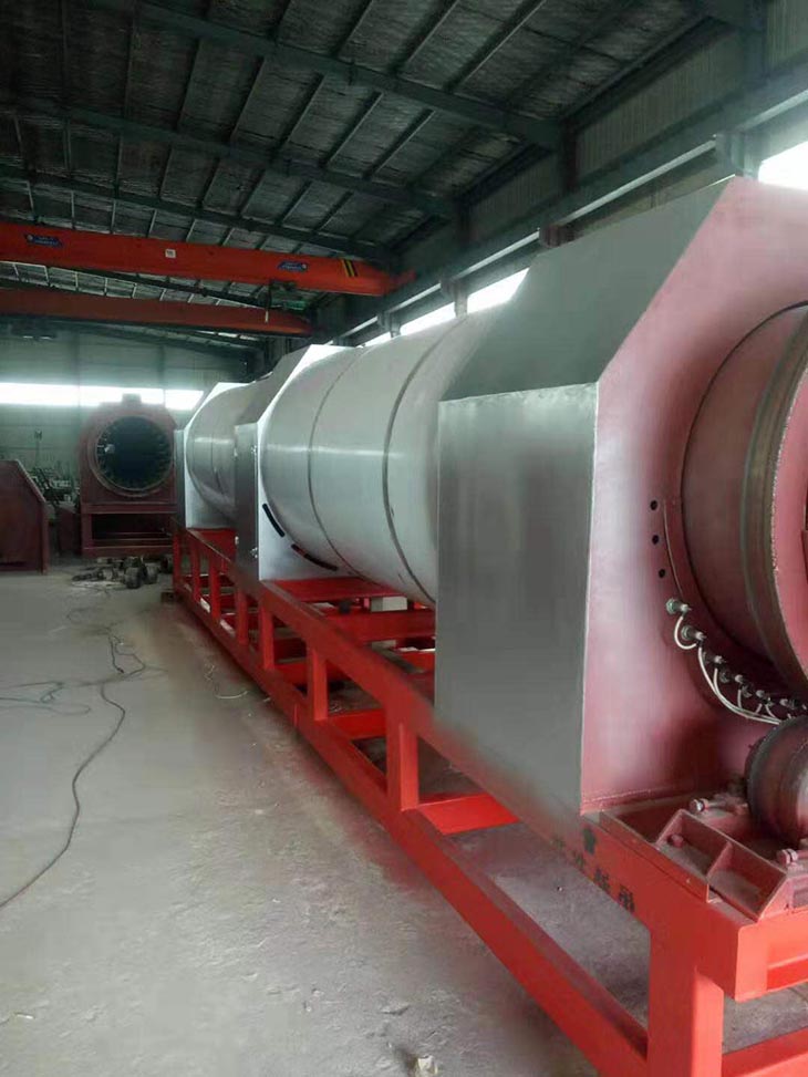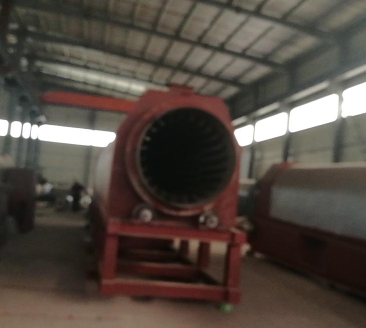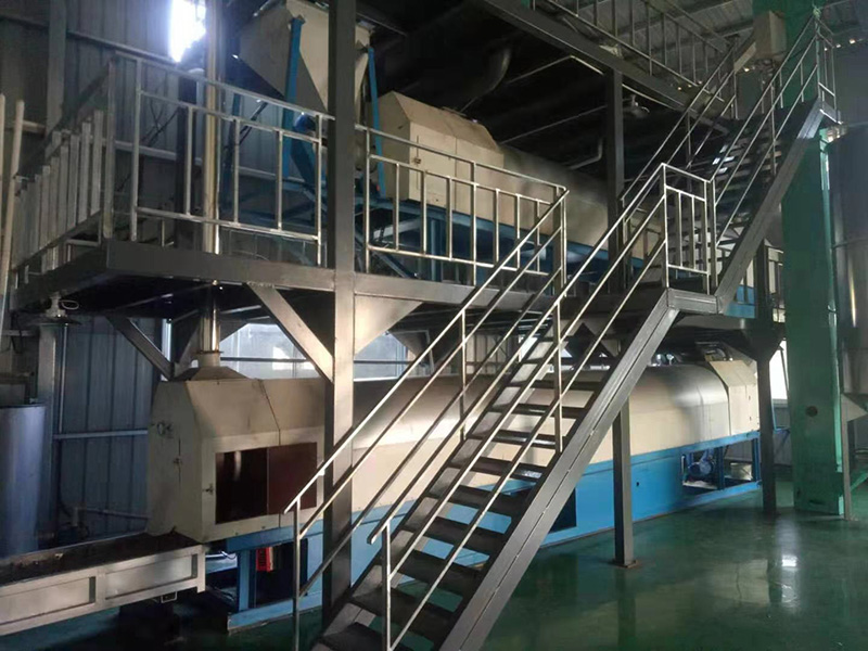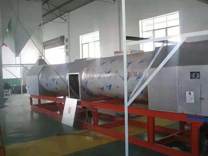 我們解決其技術問題所采用的技術方案是:一種新型環保節能熱風炒爐,由電源供電,包括第一燃燒室、第二燃燒室、熱風炒爐滾筒、存料機、自動喂料器、出料機、引風機和排潮風機,所述熱風炒爐滾筒的入口端通過自動喂料器與所述存料斗連通,所述熱風炒爐滾筒的入口端還通過風道與所述排潮風機連通,所述熱風炒爐滾筒的出口端與出料機連通,所述第一燃燒室和第二燃燒室通過風道與引風機連通,所述第一燃燒室和第二燃燒室分別位于所述熱風炒爐滾筒的下方,所述熱風炒爐滾筒軸心線與水平面形成2°到8°的夾角,所述第一燃燒器和第二燃燒器安裝位置在相應燃燒室的前端或者相應燃燒室的兩個側面。我們設備取消了原熱風炒爐所配套的單獨熱風爐、彎段風道或直段風道;在炒爐滾筒下方設計安裝兩份熱風燃燒室,用燃燒器產生的熱風直接對滾筒進行加熱,******限度地縮減了炒爐散熱環節和面積,從而實現炒爐連段式加熱。與現有設備相比,我們公司設備充分利用了熱風釋放的熱量,減少了熱量損失,單噸油料或糧食加工消耗添人氣甚至能降低到25nm3,降低了17%,節能降耗效果非常明顯,得到了客戶的一致好評。與現有設備相比,同等日加工量,所配兩臺燃燒器合計功率比現有設備燃燒器功率下降20%-30%,熱風設定溫度有750-800℃下降到400-500℃,明顯延長了炒爐的使用壽命。第一燃燒室和第二燃燒室的功能各不相同,工作溫度也不一致,第一燃燒室和第二燃燒室能夠實現分段加熱溫度控制,更加靈活與合理,安全可靠,便于操作與控制。